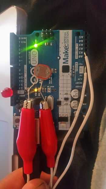 Una corriente recorre A0 a la fotorresistencia que envía tanto actual a través de dependiendo de la cantidad de luz que golpea. Luego va a la tierra y Dile el Arduino si o no encender la luz dependiendo de la cantidad de retención de trilla.