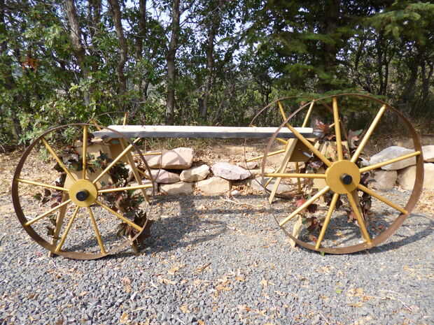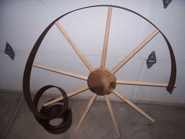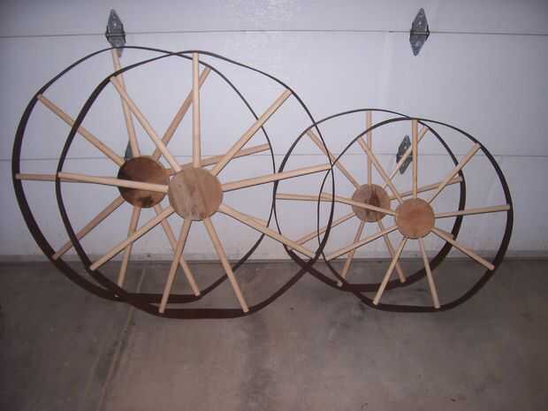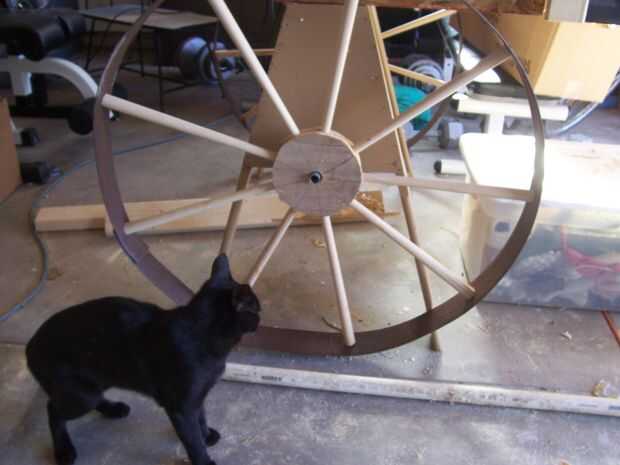 Con solamente un lado de la carroza visible desde la carretera, originalmente planeé hacer una rueda delantera y una rueda trasera, usando una sierra de calar y 2 gruesas capas de madera contrachapada. Sin embargo, la suerte fue de mi lado cuando localicé 18 tacos cónicos (28" cada) en hábitat para la humanidad. Con ruedas delanteras debe ser ligeramente más corto que las ruedas de atrás, las espigas fueron cortadas en 13" y 15" largos, darme rayos de 36, o 9 habló por rueda.