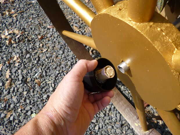 3" paisaje plástico ribete actúa como el borde de cada rueda. Después de taladrar un agujero piloto donde los bordes se encuentra con el rayo, los dos se fijan con un tornillo de madera más grande. Ambos lados de los radios y bujes están pintados de oro para el acento.
