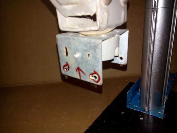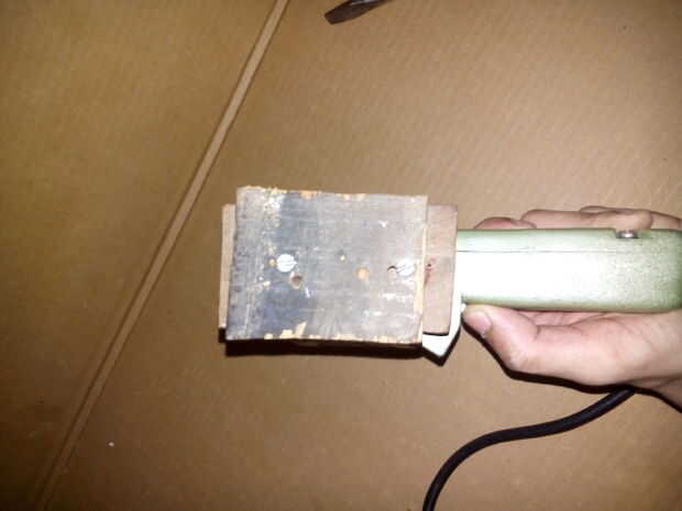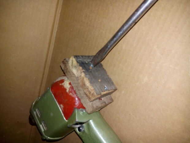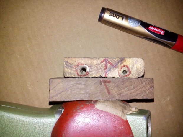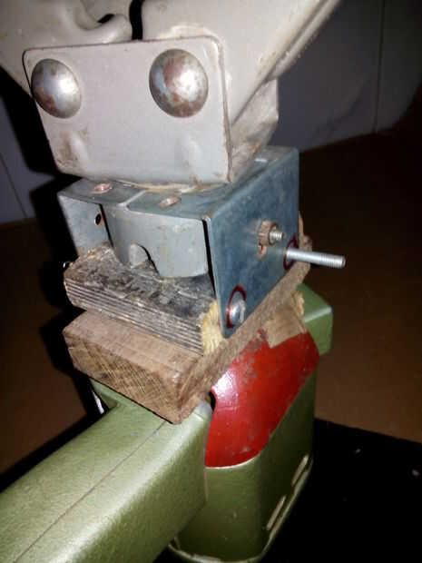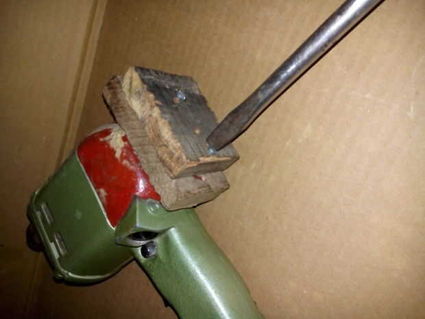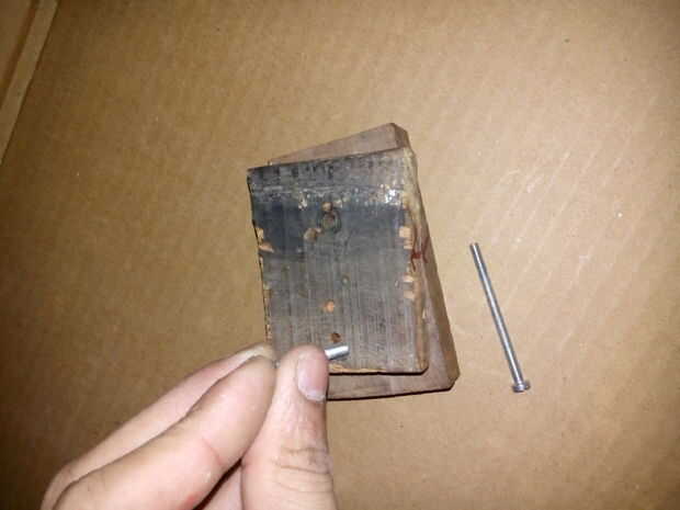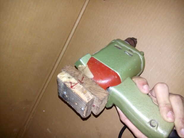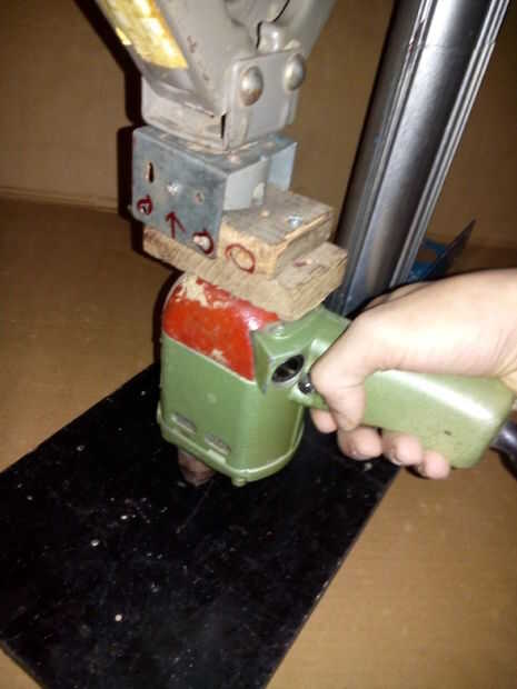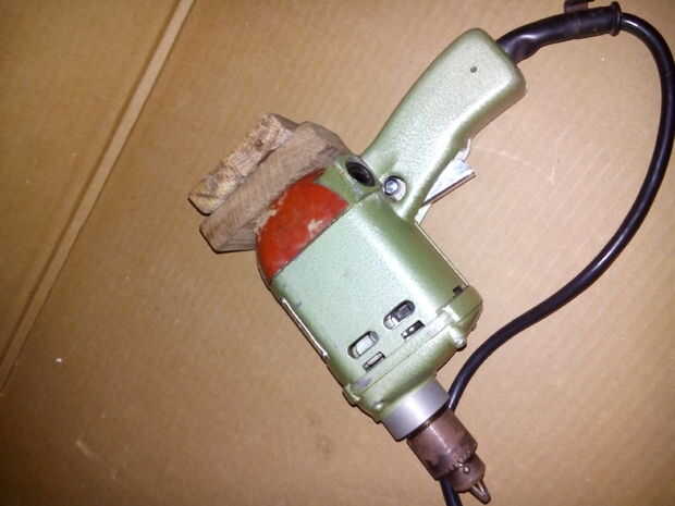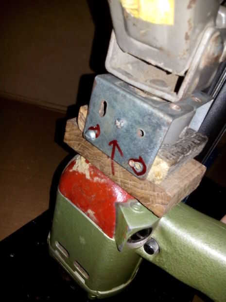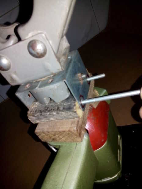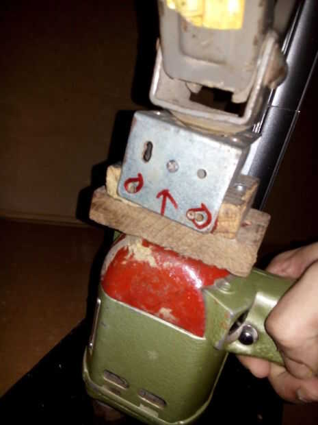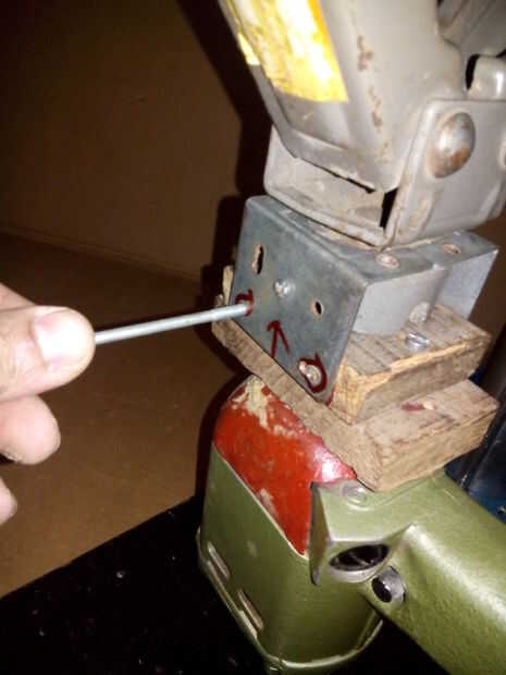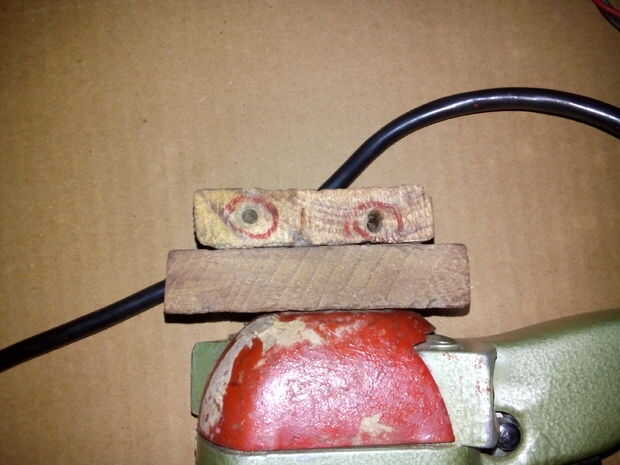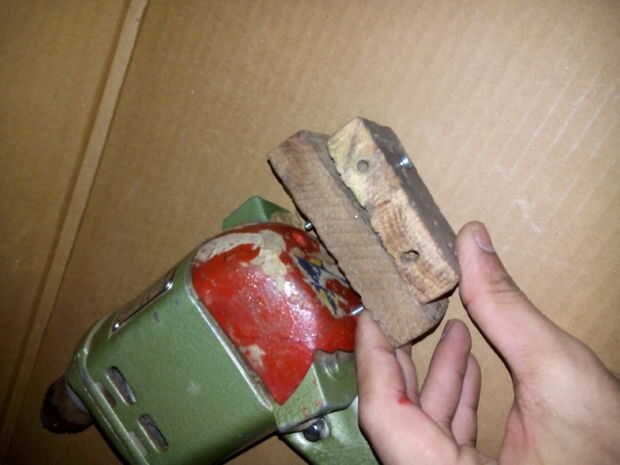 LA MÁQUINA DEL TALADRO TIENE UNA CUBIERTA DE APERTURA EN LA PARTE SUPERIOR QUE ESTÁ EQUIPADA CON UN TORNILLO. ESTA CUBIERTA SE PUEDE QUITAR. TOMAR 2 madera bloques de tamaño pequeño (APPROX L x B x ancho = 5 cm x 2 cm x 3 cm) y taladro dos agujeros en ambos la madera bloques según el agujeros de la máquina del taladro. DESPUÉS DE QUE DOS TORNILLO LARGO, PASAR A TRAVÉS DE DOS BLOQUES DE MADERA Y FIJARLA EN LA PARTE SUPERIOR DE LA MÁQUINA DEL TALADRO.
