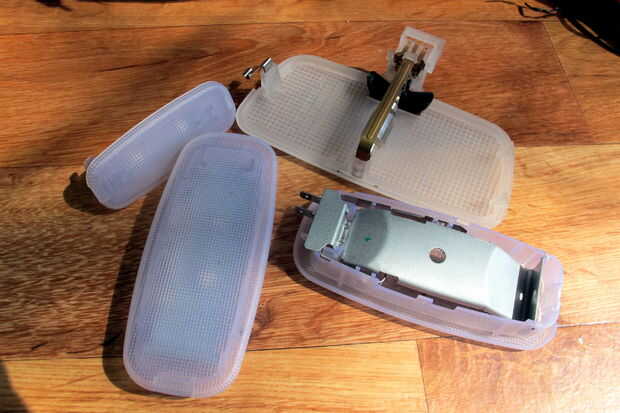Había cuatro cajas de luz en el coche que estoy mostrando aquí. Probablemente deberás usar sólo las manos para sacar las carcasas o quizá un destornillador para aflojar unos tornillos.