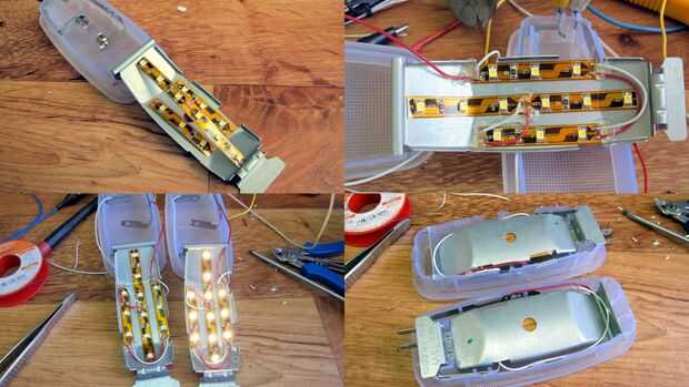 Las dos viviendas que tienen el mismo aspecto ya tenían una placa de metal en la construcción, así que decidí pegar las tiras de LED en ellos sin placas metálicas separadas de corte.