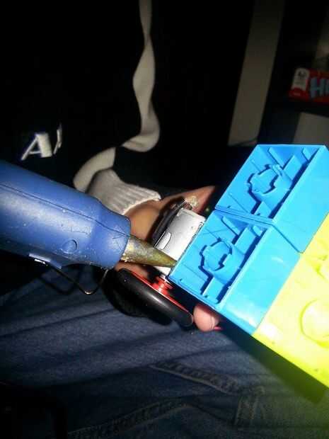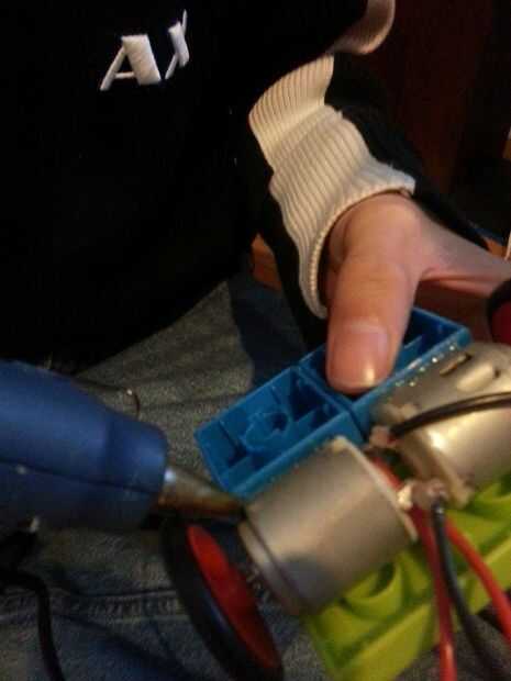 2. Conecte las ruedas a los motores que utilizan la pistola de pegamento caliente.