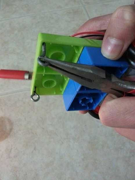1 pinzas de uso para mantener los ojos durmientes y calor el extremo por el fuego. Cuando calienta lo suficiente, será capaz de derretir el lego. En ese momento, inserte los dos ojo gal a las esquinas traseras de la lego y asegúrelo al lugar para las ruedas traseras.