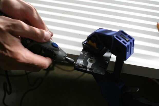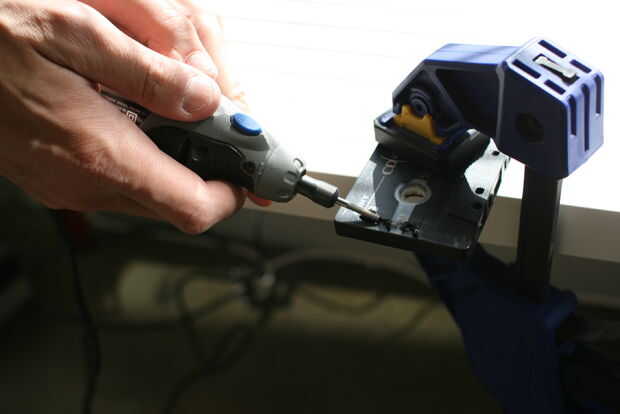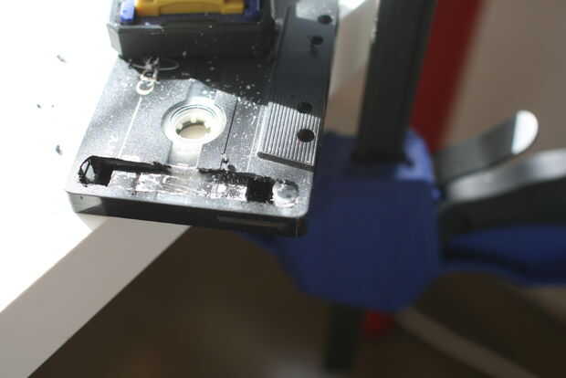 Debe tener un agujero rectangular limpio agradable. No van tan rápido como para derretir el plástico! También no ir tan lenta ya que quebrará la cinta. Probar una velocidad lenta y si es un poco 'Chateadores' poco a poco aumentar la velocidad. Yo iba sobre 30-40% velocidad en mi Dremel. Aquí estoy usando un cortador de carburo de tungsteno, pero puede utilizar a cualquier tipo de broca. Basta con hacer un agujero en la cara de la cassette, enderezar la Dremel y la ruta hacia fuera de la zona.
