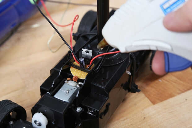 Pegamento caliente el tablero de regulador de 5V en lugar seguro y fuera del camino en el interior del marco.