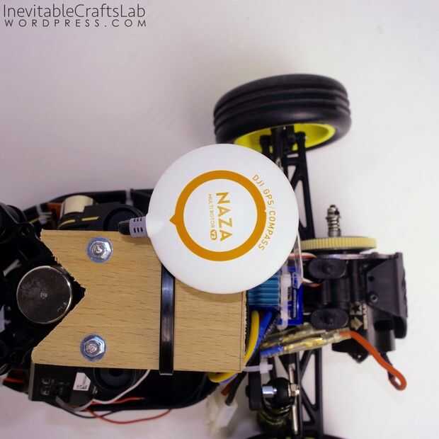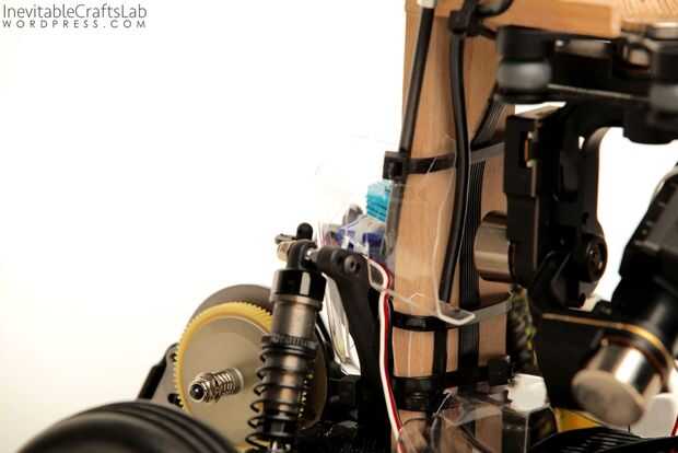 La parte de madera para montar el cardán en la Zenmuse es amarrado a la cúpula de amortiguadores trasera y se corta a 45° para hacer espacio para el motor de eje de z del cardán.