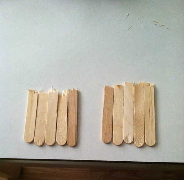 Tiempo de comenzar! Vamos a preparar algunos palitos. En primer lugar, romper cinco palitos más o menos por la mitad. Me parece que cuando rompes estos palitos con las manos, naturalmente separan en una pieza más grande y uno más pequeño. Esto funciona bien para nuestro proyecto. Una vez dividida, coloque los palillos al lado.