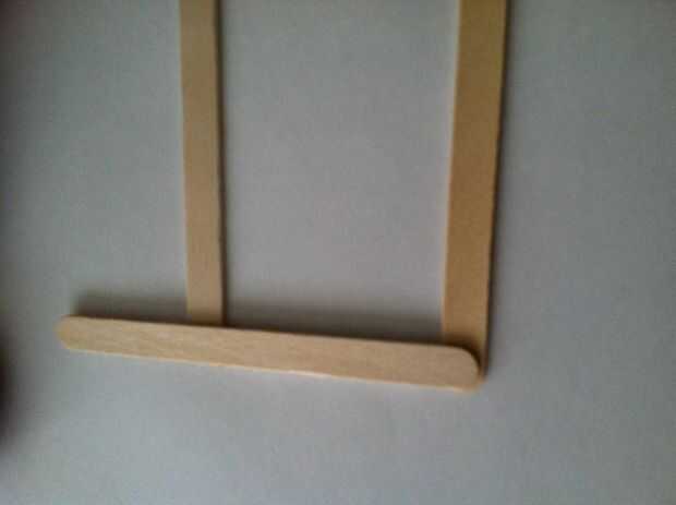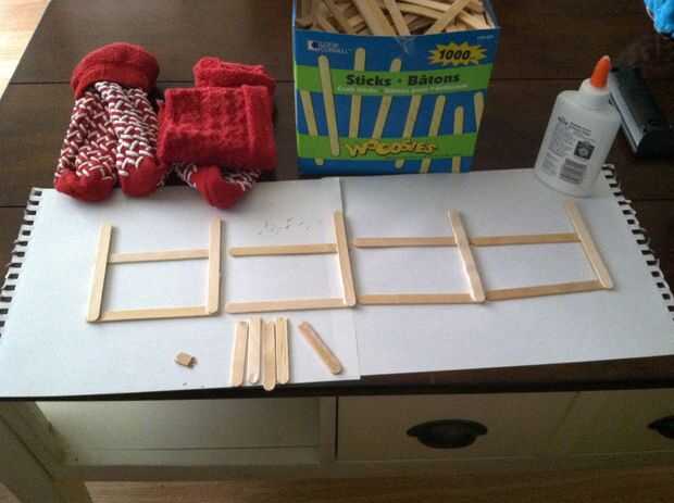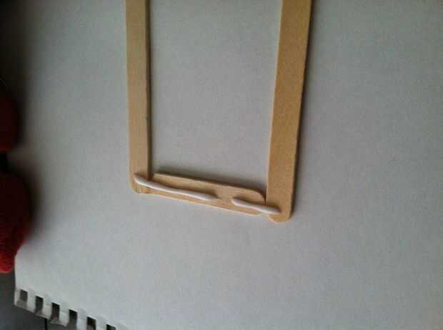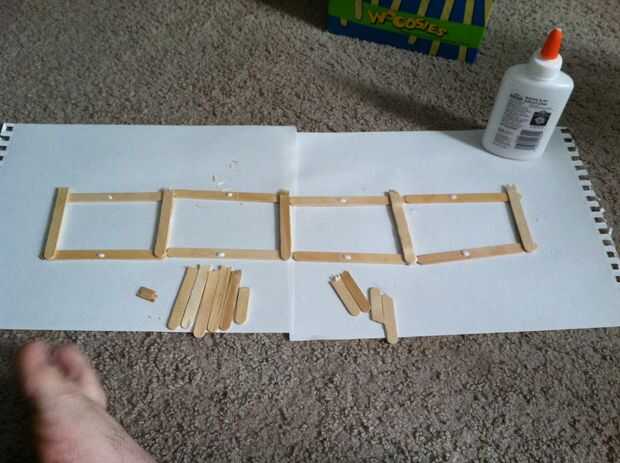 Momento de comenzar a pegar. Cosas emocionantes! Vamos a empezar colocando pegamento en los cinco palos verticales cortos. Asegúrese de obtener poco de pegamento en los palillos directamente arriba y abajo. Una vez en su cola, coloque un palillo regular en cada línea de pegamento. Presione cada palillo firmemente durante al menos diez segundos. Una vez en los palillos, volver a través y ajustar cada palillo para que coincida con la longitud de la estructura existente. La foto con mi mano ayuda a mostrar cómo ajustar estos palillos sin reventarles fuera el marco. Coloque un dedo en cada esquina de la barra y coloque el palillo con la otra mano, teniendo cuidado de mantener el palo en la línea de pegamento.