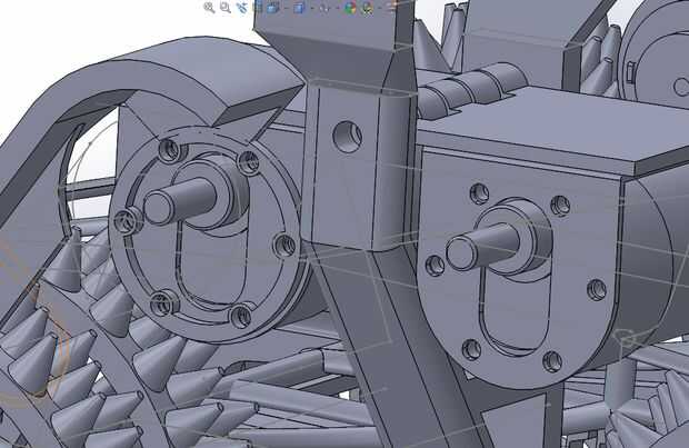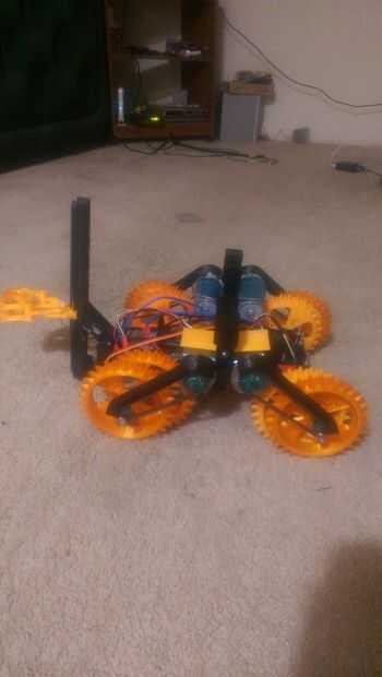 En primer lugar, las piezas de la bisagra están conectadas con el brazal con un perno o tornillo. Motores de alto par se atan y cuelgan debajo de cada uno de ellos. Yo había a jerry rig vex piñón para fijar al eje del motor. Ahora, el archivo 'Brazo juntos' son los brazos de elevación de la rueda exterior. Se adjuntarán a los motores directamente a través de tornillos. En las ruedas, cada rueda exterior tiene un pequeño tornillo extrusión de hacia fuera. En este tornillo otro piñón más pequeño de VEX se une al perno mientras sigue permitiendo el agujero en la punta de los brazos giren libremente con la rueda dentada interior. Finalmente, si usted enrolla la cadena VEX en ambos piñones, el motor, con la rueda dentada unida, debe girar la cadena girando la rueda dentada unida al perno de la rueda. Eso fue doloroso para explicar pero me avisas si necesitas ayuda.