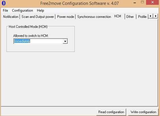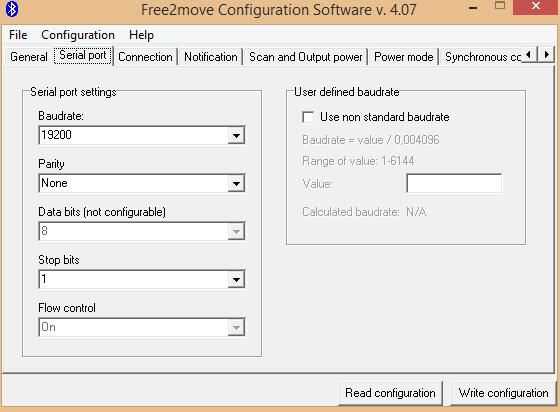 CE módulo sera paramétré at esclave avec une vitesse de 19200 baudios, 8 bits, pas de bits de profesorado, 1 bit de stop (8N1). Vous utiliserez pour cela le logiciel Software de configuración Free2move disponible sur le sitio web