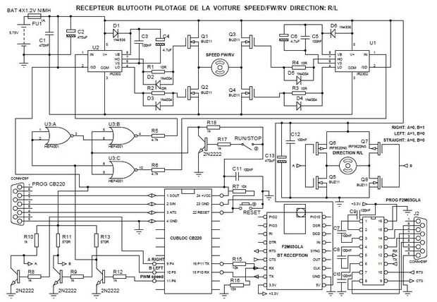 Le microcontrôleur de tipo CB220 fournira un señal PWM à une fréquence: f = 2304000/128 = 18 kHz ce qui donne un español silencieux du moteur. Il recevra les información par les llevado P10 y P11 (RX1 et TX1 en TTL) vía une interfaz d'adaptation avec le módulo bluetooth. De plus CB220 le presenta l'avantage de pouvoir être alimenté entre 5 y 12V. Enlace de 19200 baudios, 8N1 pour la comunicación RS232.