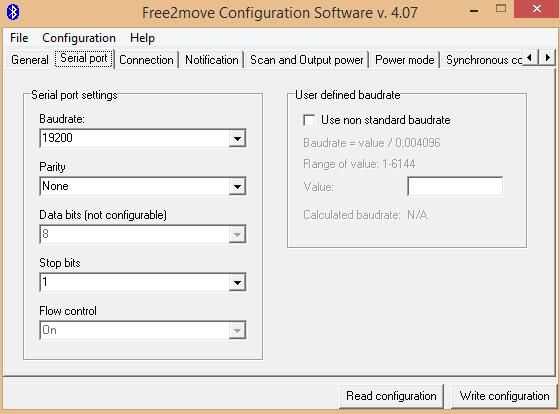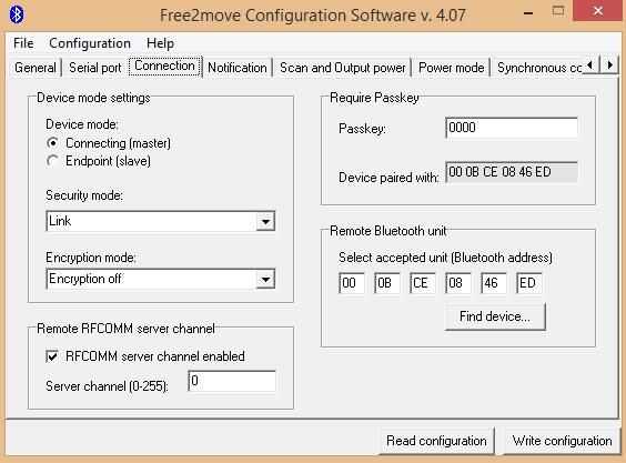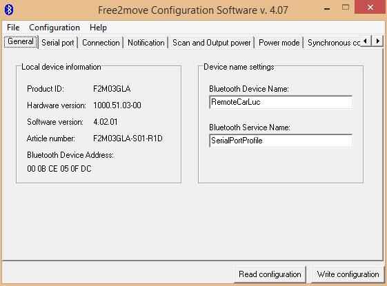 Le módulo bluetooth est ici Monte sur une placa de ma fabricación: il nécessite un circuito spécial de restablecer, une alimentación 3.3V, un circuito d'adaptation RS232. Pour paramétrer le F2M03GLA, la procédure est la même précédemment. Celui-ci devra être dijo en maître (cf juntas de documentos) et il faudra indiquer l ' Adresse MAC l'esclave (módulo embarqué dans la voiture) dans la rubrique bluetooth remoto unidad de. En enlace 19200 baudios, 8N1.