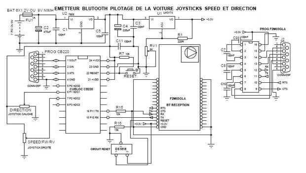 Le microcontrôleur de tipo CB220 reçoit les tensiones des potentiomètres pour les convertir en valeur numérique et les señalamos mediante salida sa RS232 (P10 y P11) et l'interface d'adaptation au módulo bluetooth. En enlace 19200 baudios, 8N1.