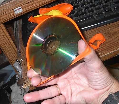 Cortar la parte superior e inferior en dos de los globos. Estirarlos sobre dos de los CDs, que más tarde serán las ruedas traseras. Esto ayudará a la tracción mucho como CD ' s son bastante resbaladizas.