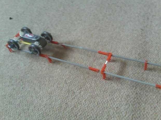 Hemos creado un robot para una competencia de robótica del colegio. La competencia fue controlar remotamente un robot que podría recoger una pelota de golf, maniobra de un curso que incluye puentes apretadas vueltas y una pista de pendiente de 30 gra