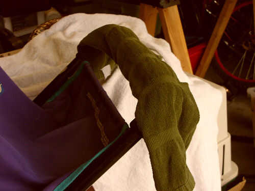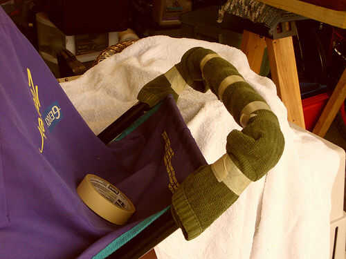 Paso 15: Fix mango si es necesario: el relleno de esta silla de paseo es rasgado, doblado longitudinalmente una toalla de mano y pegadas a la barra de la manija con cinta de enmascarar.  Cada pocos meses cortó la cinta de enmascarar, lave la toalla y poner lo nuevo.