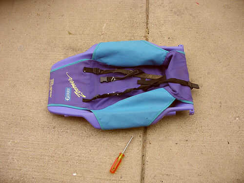 Paso 2: quitar el asiento de bebé y cualquier otras partes innecesarias .  Cada cochecito se construye diferentemente, así que busque tornillos y remaches.  Tenga cuidado de no dañar el marco.  Puede que necesite cortar algún fleje.  Tiró el asiento este 2-3 años, por lo que es un milagro que el asiento todavía está aquí para una foto simbólica.