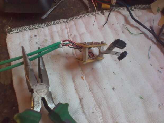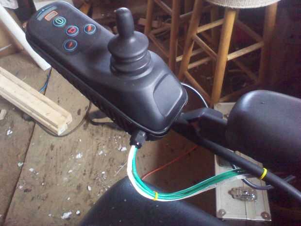 Había cortado en el cable de cinta desde la palanca de mando para el controlador. Como se muestra en el esquema de algunas de las líneas llevan directo. Yo les había soldado a una placa de circuito. Esto es lo que rompió las líneas direccionales para ir a la derivación de relé. Entonces como se ve en la foto tuve que cortar el tablero en dos para conseguir que encaje en la caja del joystick. Corrí las líneas de control de relé y la línea de control Arduino a través de un agujero que perforó en la carcasa del Joystick. Utilice un buje y cuidadoso, al taladrar. Mientras que allí yo también soldar un conductor 6 AWG 22 (22/6) a la etiqueta prueba puntos que controlan la energía, encendido / apagado, control de velocidad, fuente de 5 VDC y tierra y un conductor de repuesto. Estos puntos se pueden encontrar bajando por el lado izquierdo de la tarjeta de control. Luego cerrar y volver a montar la palanca de mando en la silla de ruedas.