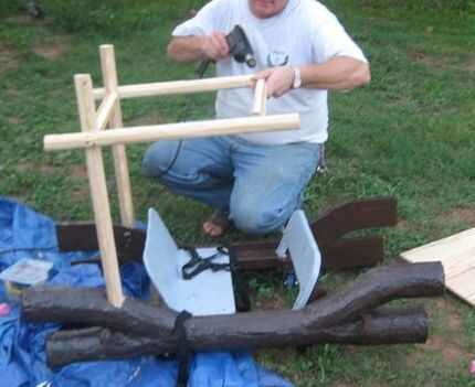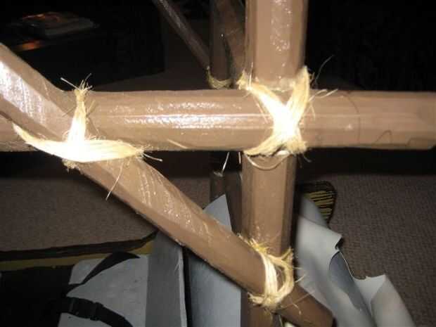 Una vez las columnas estaban en lugar añadí el resto de las piezas con pegamento y tornillos de 3". Siempre taladré orificios piloto para asegurar que la madera no se dividiría. Después de pintar las piezas de madera superior azotó con cordeles de fibra natural. Entonces pegué todos los nudos y otros Cruz juntas la guita no puede aflojar ni desentrañar.
