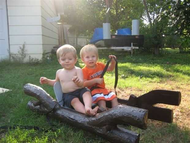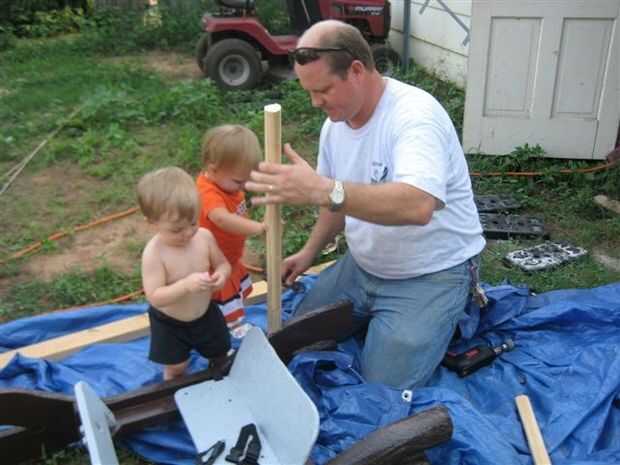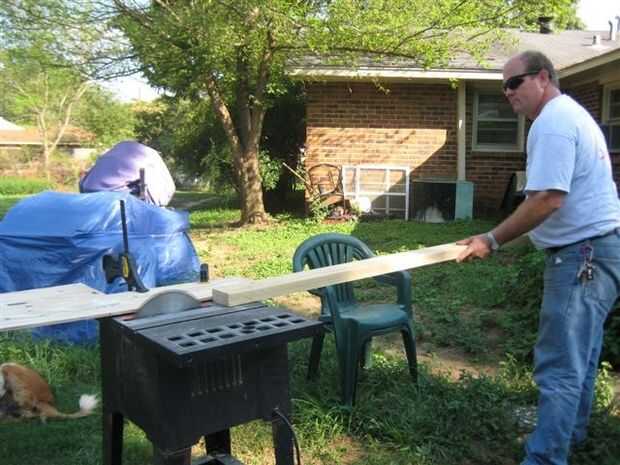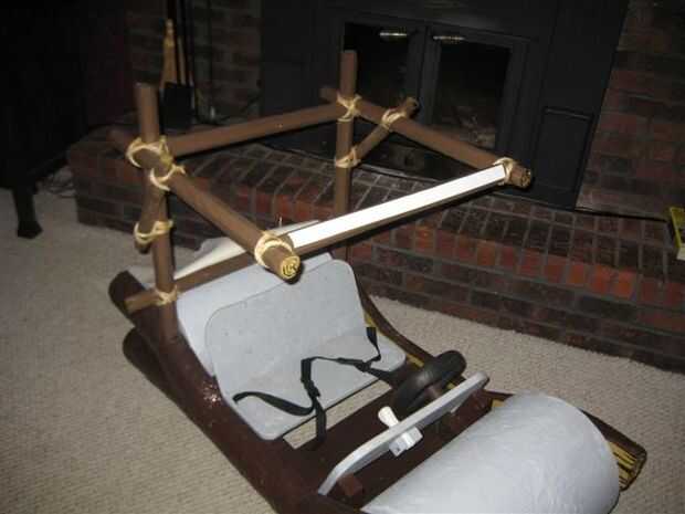 Después de que los niños estaban con seguridad interior que usé una sierra y un taladro eléctrico para cortar aberturas por los lados. Se montaron los postes verticales a la madera contrachapada utilizando pegamento del gorila y los tornillos. Te encargaste a montar con seguridad ya que también servirían como los mangos para empujar el coche.