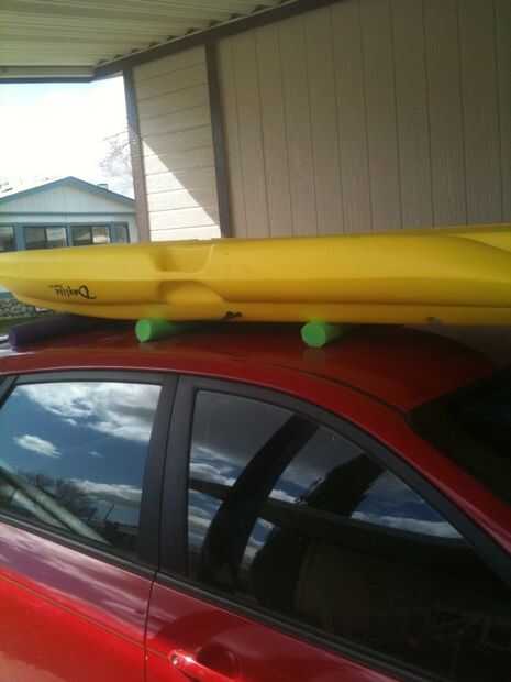 Levante su kayak y colocarlo encima de los tallarines de la piscina. Si se deslizan alrededor, es bastante fácil de levantar un extremo del kayak y vuelva a colocar los fideos que desee. Con tres fideos, obviamente quiere poner uno hacia el frente, uno en el centro y otro hacia la parte trasera de su coche. Asegúrese de que el kayak se equilibra bien para no iniciar desplazamiento fuera de la azotea del coche antes de tener oportunidad de correa hacia abajo.