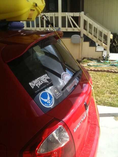 Sólo para estar seguro, puse una cuerda del amortiguador auxiliar en la parte trasera del kayak así. Es fácil de enganchar desde la parte inferior del bastidor del coche para controlar el kayak.