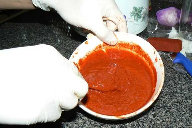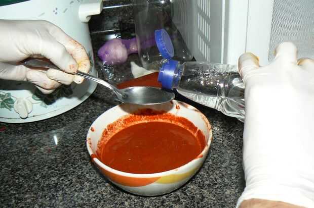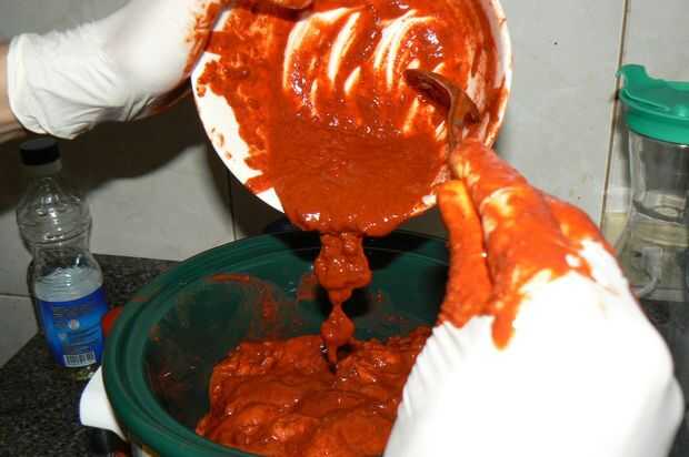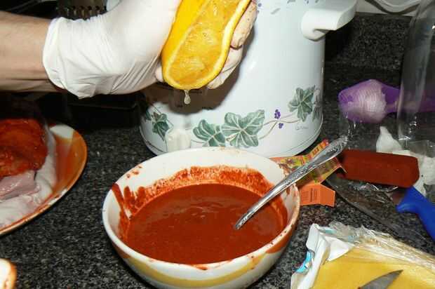 -Exprimir el jugo de naranja sobre el achiote de corte/rallado, no demasiado, sólo lo suficiente para que la mezcla puede ser pasta para tener un buen masaje para la carne de cerdo.