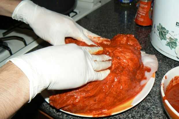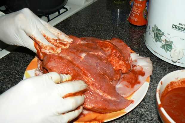 -Coloque más cucharadas de la pasta y frotar hasta que la pieza de carne es todo bonito y rojo.
