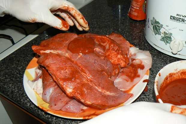 -Colocar un par de cucharadas de la pasta sobre la carne de cerdo y comenzar frotando bien en todos los rincones y grietas.