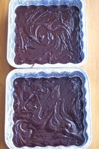 Mezcla la tu brownie mezclar según las instrucciones del paquete o hacer de cero. He usado rojo molino Brownie Mix de Bob, vierta la mitad de la mezcla de brownie en cada bandeja para hornear engrasada.
