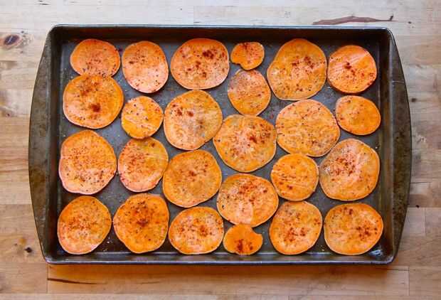 Mientras calienta, difundir sus rondas batata recién revestido y especiado en una placa para horno. Asegúrese de que estén demasiado propagación todos hacia fuera y no superpuesta. Que tenga que hornear en rondas.