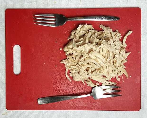 Retire el pollo y déjelo enfriar. Desmenuzar el pollo en una tabla de cortar y apartar.