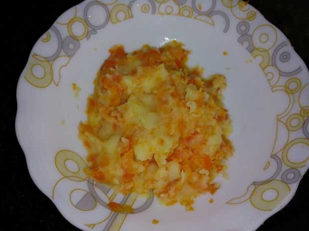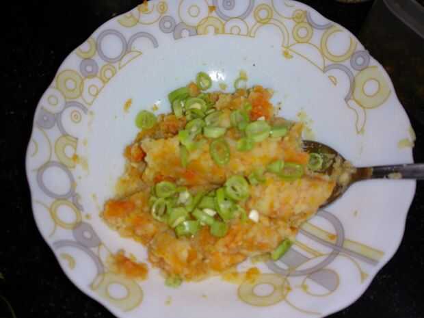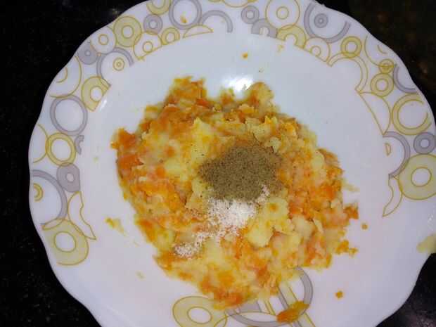 Puré de la patata y la zanahoria juntas. Añadir la sal, pimienta y orégano. Añadir las otras verduras y darle una buena mezcla.