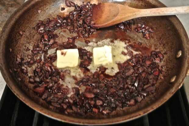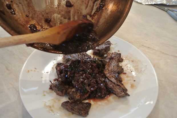 Después se reduce la salsa, derrita la mantequilla. La mantequilla le ayudará a espesar la salsa. Luego, vierta los jugos de la carne que se agruparon en la placa debajo de la carne vuelta y vuelta. Por último, retirar del fuego y batir en las hierbas y finalistas. Sazonar con sal y pimienta al gusto. Verter sobre la carne vuelta y vuelta y servir.