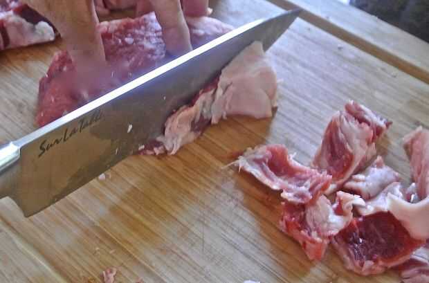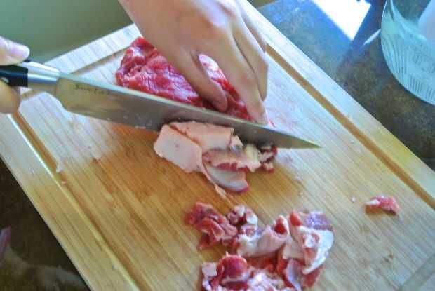 Recorte la grasa alrededor de la carne hasta que quede casi ninguno. Estoy usando una mezcla de solomillo y costillar. Demasiada grasa hará que la carne se esparcen sobre la bandeja, así que asegúrese de que ha ido.