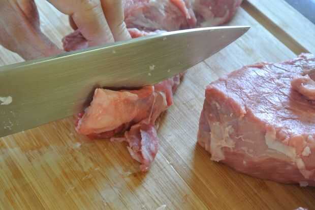 Cortar la carne basada en cómo se preparará. Si se utiliza para un cocido, por ejemplo, cortar en trozos pequeños. No voy a cortar mi carne porque estoy preparando cada pieza que se comerá todo.