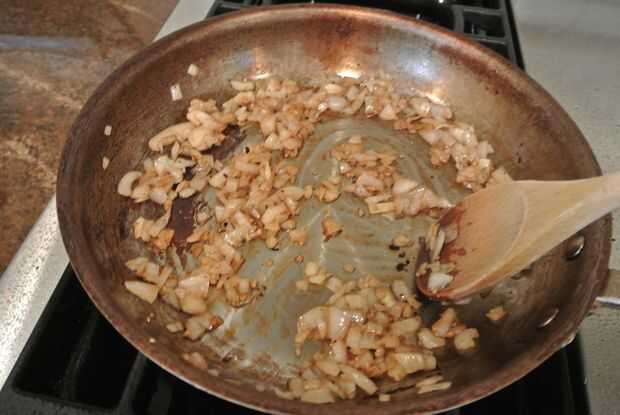 Para empezar, compruebe para ver cuánta grasa hay en la sartén. Si hay mucho, algunos derramar. Si hay menos, añadir un poco más. Añadir la cebolla, ajo u otros compuestos aromáticos a la sartén. Estoy usando un poco de cebolla y ajo. Sobre fuego medio, revolver para cocinar todos juntos, alrededor de 2 minutos. Asegúrese de que no se queme.