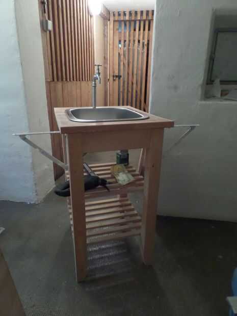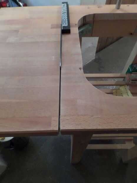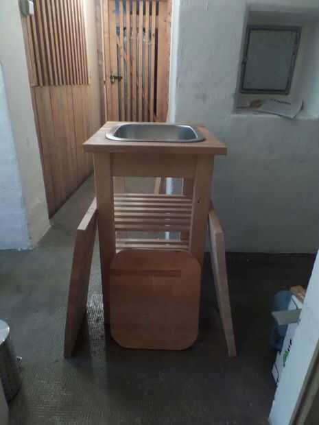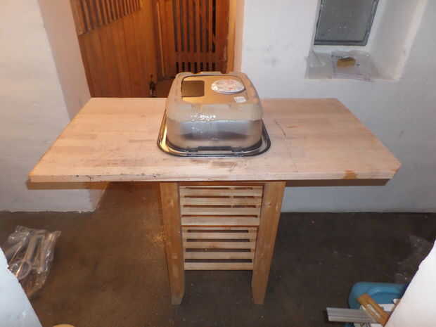 Primero construí la unidad del fregadero. La cubierta fue reducida a 110 cm (debido a un borde muy feo...), luego aserrado de las alas (30 cm) por lo que para la parte media hubo cerca de 50 cm a la izquierda. No te olvides de marcar, que ala pertenece donde y si trabajas con una sierra de mano circular hacer su marca y parte de la corte para arriba!