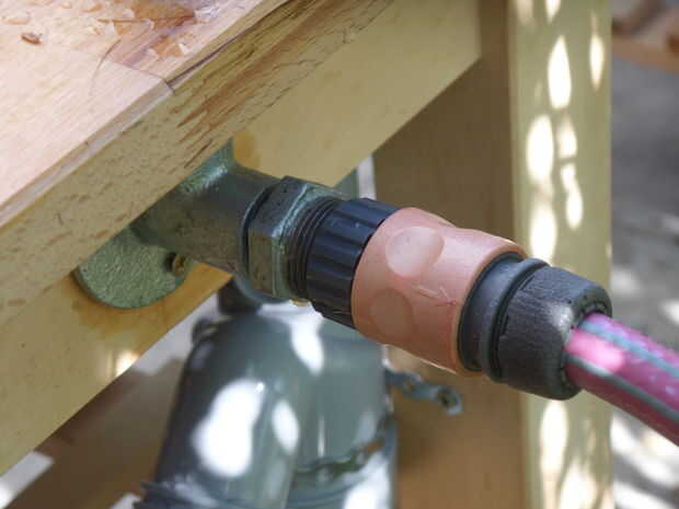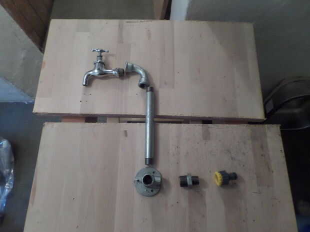 Empecé con una llave que tenía en stock, añadió algunos suministros de plomería básica para terminar en un conector Gardena en la parte trasera del carro. Para aquellos no familiarizados con Gardena: es un tipo de enchufe y juego sistema para regar el jardín y la empresa detrás de él se encuentra aquí, donde vivo en Ulm, Alemania.