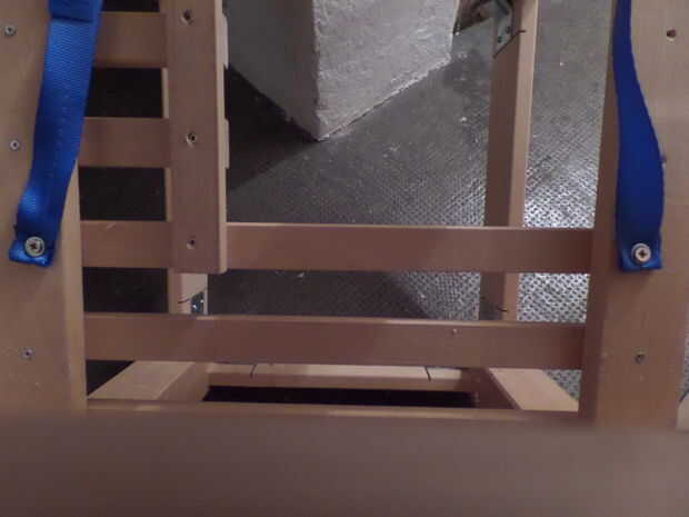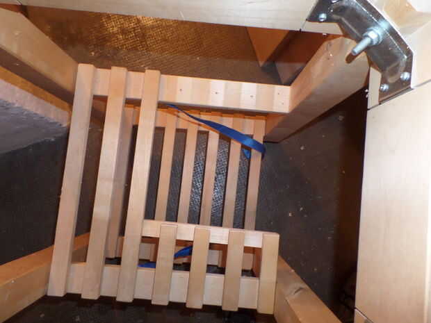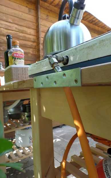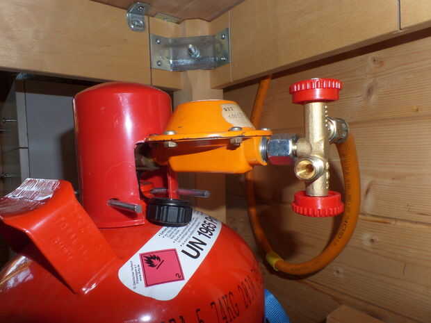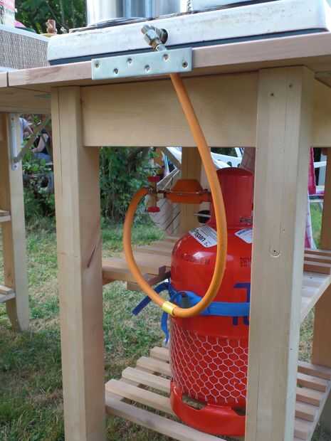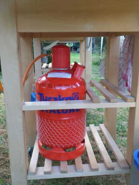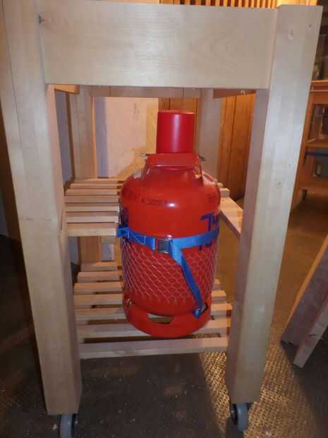 Para almacenar y asegurar la botella de gas acortó cuatro listones en la parte trasera del estante intermedio y con uno de lo listones, de corte resecured atornillar a los extremos de la desventaja para arriba. A continuación os adjunto una correa para sujetar la botella en su lugar.