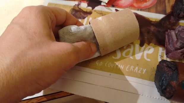 Hacer un pequeño burrito de pelusa de su pelusa y hoja de secador, plegar los extremos y meter en el tubo de papel higiénico medio. El gordo haces tu burrito, más bien que se ajusta en el tubo y mejor permanecerá juntos cuando mates en el baño de crayón derretido. Y mejor que se queme después, también.