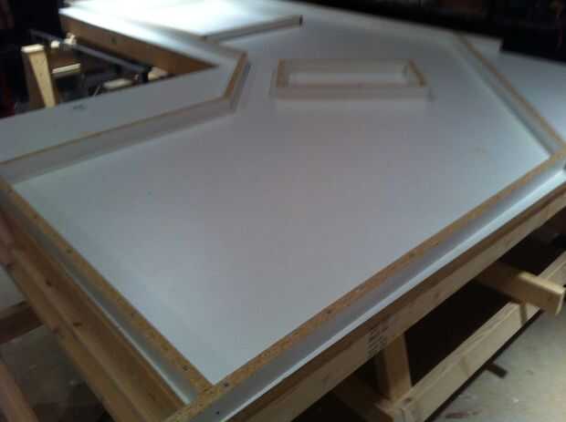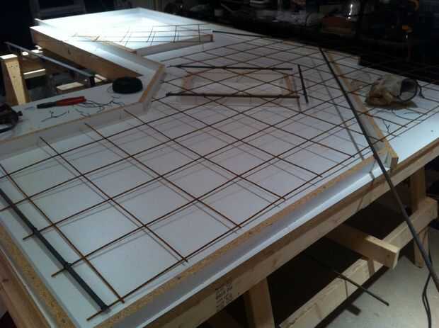 Melamina fue utilizada para la formación de la encimera. hojas de 4'x 8' están disponibles. Este contador se vierte hacia abajo. La melamina es una superficie súper suave que produce una superficie muy lisa de concreto. Construí algunos caballetes muy robusto para mantener el contador principal a un nivel confortable de trabajo. Tiras de melamina fueron cortadas por los bordes y atornilladas a la base de la forma. Una cosa importante aquí es que usted necesita llenar las cabezas de los tornillos con cera o masilla antes de verter. De lo contrario, el tornillo de cabeza se llenará con hormigón y no será ser muy divertido para cuando llegue el momento de romper la formación. Después de la formación inicial está anclada en su lugar, reuní la malla de varilla de refuerzo. He utilizado la varilla #3. Si hay agujeros o uniones, pueden befilled con cera y raspado. La costura donde los bordes de forma cumplir con la gran superficie plana de la forma puede rellenarse con un cordón de silicona de calafateo, funcionando un dedo abajo de la costura para crear un buen radio en el borde del mostrador. Si usted necesita algún agujero, es mejor ponerlos en ahora. Pongo en un par de agujeros para las luces que quería montar. Utiliza un trozo de espiga, perforó un agujero en el centro de la clavija para un tornillo y había atornillada en la forma de la parte inferior. Yo también había cubierto les con un poco de silicona por lo que podría ser perforados hacia fuera fácilmente. Poniendo éstos en ahora en el lugar de perforación la encimera más tarde elimina la posibilidad de perforar algunos de la barra de re más adelante.