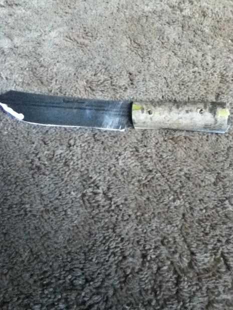 Este es un cuchillo de cocina que hice para mi mamá. Dijo que cuando ella utiliza las manijas en nuestra cocina cuchillos le duele la muñeca. Hizo una corta hoja amplia que rocas de fácil y me puso una manija curvada delgada. También usé un archivo p