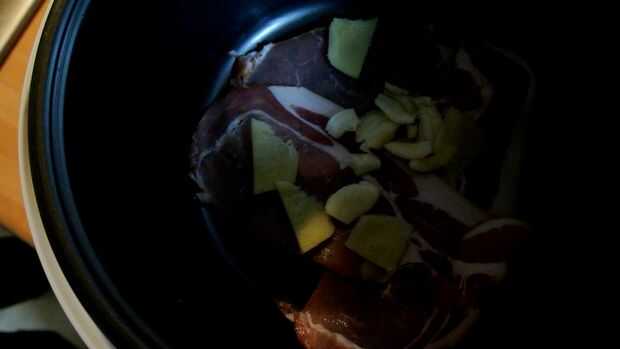 Lugar tocino en olla arrocera seguido del ajo y el jengibre y encienda para cocinar.