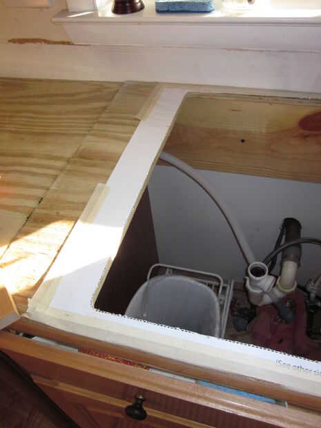 Dryfit la Junta y obtener bajo el fregadero y dibuje hacia fuera lo que tiene que cortar desde la parte inferior con el corte de la madera como su plantilla.