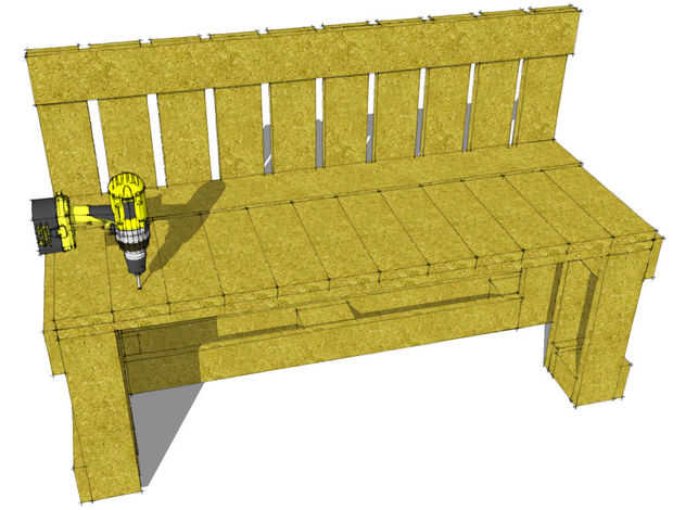 Taladro, avellanador y el tornillo de la superficie de trabajo los listones en su posición.