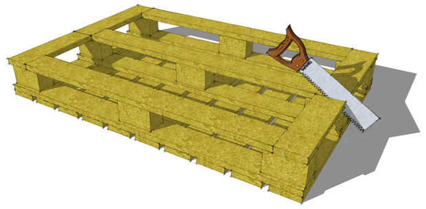 Ponga una de las paletas de madera boca abajo y vio a través de los dos listones de madera de exteriores, como se ilustra.