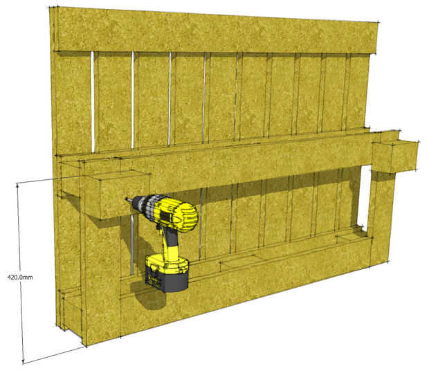 Usando los bloques que se quitaron en el paso 2, Coloque estos 420mm del borde más bajo de la plataforma, taladro, avellanador y tornillo en la posición como se muestra.
