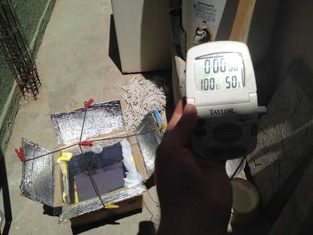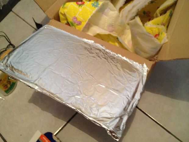 Las aletas ahora se cubrirá con papel de aluminio que forman los espejos. Estos espejos centrarán más luz en el horno para aumentar la temperatura.